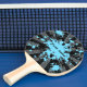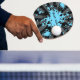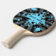 A ping pong paddle to personalize with your name in a blue paint splash design on black and grey stripes.