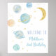 Welcome your party guests with an adorable personalized sign. Frame the sign and display it on a table near the entrance or mount the poster on foam and display it outside on an easel. This adorable design features hand painted watercolor planets with faux gold foil stars.