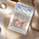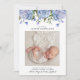 Carte de faire-part de naissance rustique avec une photo verticale de votre nouveau-né avec aquarelle illustration de pivoine bleu clair avec verdure.