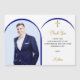 A Confirmation magnetic photo Thank You card. Add a vertical size photo. A blue coloured arch shaped photo frame. Personalize and add a name and details.
