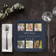 For a 50th (or any age) birthday, celebrating his/her life with a collage of 6 of your high quality photos of her, her friends, family, interest or pets. Personalize and add a name, age, date. A dark blue background.