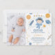 Cute outer space or first trip around the sun first birthday invitation for a baby boy featuring, a small sun, planets, stars and spaceship. This outer space birthday invitation features a photo on the left hand side of the invite.