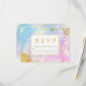Blue and pink watercolor, gold foil confetti and specks wedding RSVP response card.