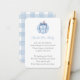 This baby shower enclosure card design features a hand painted blue and white plaid pumpkin with a dark blue bow. The wording is a poem requesting guests to bring a book instead of a card but all of the text can be customized to your needs.
