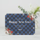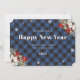 Blue buffalo plaid New Year card featuring snowflakes and a watercolor painting of poinsettia, holly and red berries. Easily personalize online.