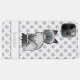 Destei's original cartoon illustration of a cute blue point tabby coat colour Birman / Ragdoll breed cat. The background has a pattern of grey cat paw prints. There is also a personalizable text area in grey colour for a name.