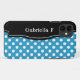 Coque iPhone 5 élégant conçu avec un pois blanc sur motif bleu, un cadre noir sur le côté gauche, et personnalisé avec votre nom ou texte personnalisé en blanc sur le cadre noir. Cette conception est parfaite pour l'utilisation verticale et horizontale de l'iPhone 5.