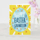 This design shows a large sky-blue oval in the middle, dotted with lighter blue spots that give it a soft, bubbly look, with a sunny yellow field around it that feels like a warm embrace between friends 🌷. Thick white rays stretch outward from the oval into the yellow area, like a gentle burst that frames the message with extra attention. Small glossy orange circles are sprinkled across the yellow border and inside the blue oval, like little treats scattered for a shared celebration 🐰. Centered inside the oval, the word “HAPPY” sits near the top in bold white letters. Below it, “EASTER” appears in dark blue, set larger and steadier so the eye lands there next. Near the bottom, “GRANDSON” is written in dark blue with curled letter shapes, adding a tender, affectionate touch to the layout. A small circular accent sits near the upper right of the oval, while the orange dots and white rays continue to ring the bright yellow background.