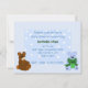 Customize this sweet soft blue shower invitation as desired. A centre background of blue and white polka dots. Two little bears one in brown and one in a pretty blue with a bow and gift.