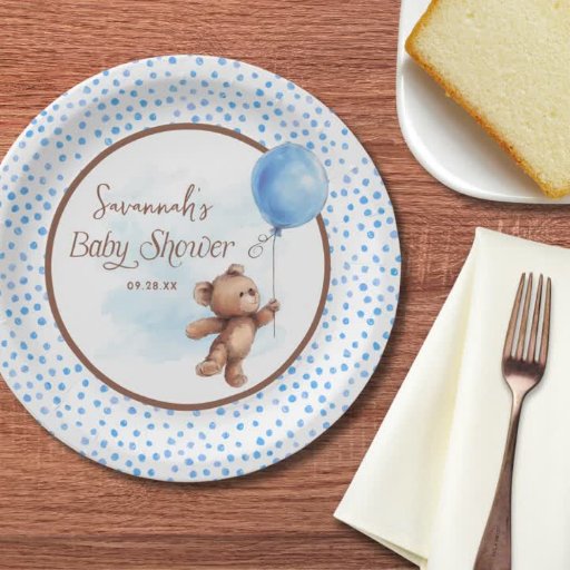 A cute, cuddly teddy bear holding onto a blue balloon. Watercolor polka dot pattern. Whimsical, handwritten style fonts. Blue and brown colour palette. Use the Edit Tool to select different fonts or resize/reposition the bear. © Kimbellished, LLC