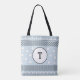 Cute tote bag with monogram, criss-cross accents and white polka dots and geometric pattern. Background is pastel blue.