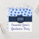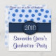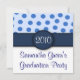 These adorable invitations are light blue on the upper half with medium blue polka dots. The bottom of the invitation is solid white with navy blue font. The upper and lower halves are divided by a solid navy blue band with a navy blue circle where you can add your own text, either a graduation year, monogrammed initial, etc. The reverse side of these invitations is a muted light blue with med. blue polka dots and navy blue font. Text can be customized to suit your needs. These invitations are perfect for graduations, baby showers, birthdays, housewarming parties and so much more. The example shows invitation being used for a graduation party. Celebrate in style with these Blue Polka Dot Party Invitations!