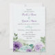 romantic blue and purple flowers green leaves wedding invitation