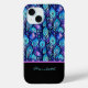 The vivid blue and purple peacock feathers form a fascinating, almost tribal pattern in this deign. Each feather has additional symbols and patterns embedded within it for an inspirational look. Your or your recipient's name appears in script against a colorblock of black at the top of this distinctive phone case, available on multiple styles of iphone and Samsung cases.