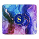 A trendy Blue, Purple, and Red-Violet Liquid Ink design with personalized yellow Monogram in dark blue and gold circle.