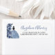 Blue Quinceañera Return Address Label Sticker. This elegant design features soft dusty blue and navy blue floral accents paired with a charming illustration of a girl in a dress with a tiara, placed on the left side for a balanced and eye-catching layout.