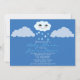 A modern and adorable baby shower invitation with a blue background, featuring a happy rain cloud.
