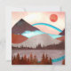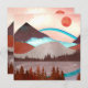 Mountain landscape scene in reds and blues with a lake and a bold blue rainbow.