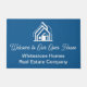 This professional realtor doormat is custom made with your real estate company name under the modern welcome in white cursive script for an open house. This chic custom blue realty business decor features a house logo image for home builder or realty agent company marketing.