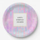 Birthday paper plates with an abstract background pattern. Pink purple and blue watercolors make up this artistic design which features vertical rectangle shapes on a soft mottled background. A square layered over top with a faux gold foil border, your personalized text inside.