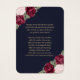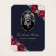 Beautiful blue floral memory card/funeral prayer card featuring a photo adorned with blush pink and burgundy red roses and baby's breath on a dark blue background.