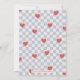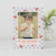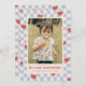 A festive Valentine's Day card with red hearts scattered over a bright blue chequerboard design. The message and customer information is placed beneath a large photo, and the back of the card features a coordinating pattern.