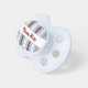 This pacifier features blue, white, and red stripes. Can be personalized with baby's name in the centre.