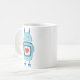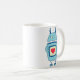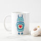 Blue robot mug with a cartoon illustration of a blue clumsy cartoon robot holding a plate with a heart. This cute mug is suitable for kids and geeks who love robots and cute illustrations.
