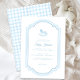 Celebrate a new arrival with this elegant blue rocking horse baby shower invitation. Designed with a soft gingham border and classic frame, this traditional style is perfect for a boy baby shower. Personalize with your details for a timeless invitation that family and friends will cherish.