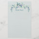 This lovely page is headed with a garland of a blue watercolor rose mixed with light violet foliage, teal and mint leaves. All printed over a pale stripe blue stationery paper image which is blank (also blue) on the back.