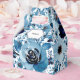 A beautiful illustration of large blue roses and small daisy style wild flowers surrounded by leaf sprigs set against a white background that has a scallop edge banner edged with blue and faux gold on it for your personalized wording. These are ideal for country wedding; spring day celebrations; bridal and baby shower parties.