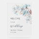 This elegant wedding welcome board features layered dimensional blue and gold flowers on a transparent background.