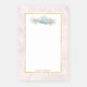 Large format sticky notes personalized with a name. Designed with a photo of blue roses surrounded by sprigs and leaves and fancy baubles. The baubles also form a crown shape. White flowers and pretty blue bows and white lacy ribbon also surround the roses. A white frame with a faux gold foil border layeredover top to write your notes inside. Set on a dusty pink marble background.