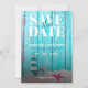 Rustic, weathered teal blue wooden boards with lighthouse and beach cottages decorations and a starfish on a sandy beach form the backdrop of this quirky Save the Date card. Are you planning a beach wedding in a tropical locale? Then this design is for you. You can add your favourite photo to the back. Note: the template photo has an active filter to match the look on the front of the card. You can change or remove it to suit your style.