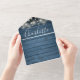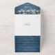 All in one wedding invitation featuring pretty string lights, mason jars, signature style names and chic typography on a blue rustic wood background. The invitation includes a perforated RSVP card featuring a QR code. Designed by Thisisnotme©
