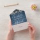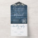 All in one wedding invitation featuring pretty string lights, mason jars, signature style names and chic typography on a blue rustic wood background. The invitation includes a perforated RSVP card that can be individually addressed or left blank for you to handwrite your guest's address details. Designed by Thisisnotme©