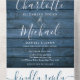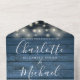 All in one wedding invitation pretty string lights, signature style names and chic typography on a blue rustic wood background. The invitation includes a perforated RSVP card featuring a QR code. Designed by Thisisnotme©