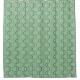 This shower curtain has an art deco design of blue and purple half circles connect with lines on a field of light green.