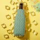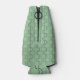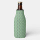 This bottle cooler has an art deco design of blue and purple half circles connect with lines on a field of light green.