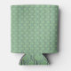 This can cooler has an art deco design of blue and purple half circles connect with lines on a field of light green.