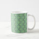 This mug has an art deco design of blue and purple half circles connect with lines on a field of light green.
