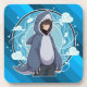 Illustration of a boy in a shark hoodie with a serene blue circular background.