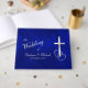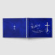 This is a beautiful traditional Christian wedding guest book that combines a dark gradient blue abstract background with glowing silver. At the centre right front is a simple silver cross with two silver hearts at the foot of it. Your custom text is to the left of the cross and heart images, and also in silver. The back of the book has the same blue background, with a smaller image of the hearts and cross at the centre. Be sure to see the matching products, including wedding invitations, in our store.