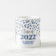 Customizable photo template class of 2022 graduation mug with silver and blue confetti pattern.