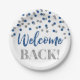 Welcome back paper plates in Silver and Blue confetti pattern.