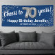 Elegant seventieth birthday party banner featuring a stylish blue background that can be changed to any color, silver sparkly glitter, seventy silver hellium balloons, and a modern 70th birthday celebration text template that is easy to personalize.