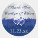 This 1.5" round shaped royal blue and silver grey floral wedding favour thank you sticker has a PRINTED ribbon and bow with a pair of PRINTED diamond jewel and FAUX glitter (simulated) joined hearts on it that matches the wedding invitations shown below. It's a perfect way to send out a beautifully coordinated thankyou card, or you can use it to attach to your wedding favours or candy buffet packaging. If you need any other shapes of sticker, or colour changes, please email niteowlstudio@gmail.com. ***FOR BEST RESULTS, please email me if you want a different size of sticker, or want a different font. The safe margins on the stickers are quite large so if you extend beyond them, your text may get cut off.