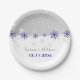 Blue, silver grey, white snowflake wedding paper plate, featuring stars and elegant blue snowflakes on grey. Text in blue and grey. A stylish design perfect for your winter, December or Christmas wedding. Modern and contemporary yet suitable for a traditional wedding, bridal shower, reception, engagement, or anniversary party.