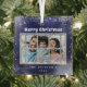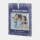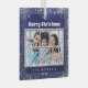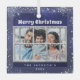 A deep blue background decorated with faux silver glitter, sparkling stars. The blue colour is uneven. Personalize and add your own photo, name and a year. With the text: Merry Christmas. A window overlay over your photo.