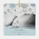 Celebrate baby's first Christmas with this elegant personalized blue and silver snowflake ornament. This ornament is fully customizable! You can edit the text and add your own photo by clicking "personalize this template". This personalized baby's first Christmas ornament feature a custom photo of your baby and space for your baby's name and the current year. Hand drawn icy blue, white, and silver glitter snowflakes are clustered around the top as a cute winter frame and the text is in grey. Classic blue and silver Christmas colour scheme make this photo keepsake ornament festive but classy.